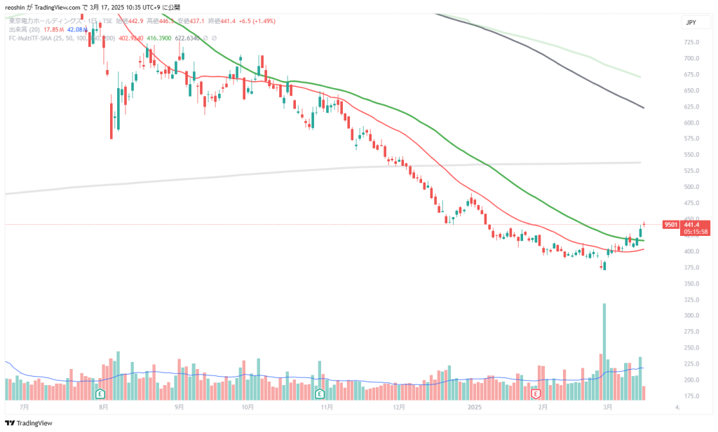 スイングトレード part.4 スイングトレード X Facebook はてブ LINE コピー 2025.03.17 今回は東京電力にIN。 株価の底でかなり大きな出来高を伴っており、底を固めて少しずつ上がっているようにみえるためIN。 巨大な陰線をつけたり、25日SMAを下回ったらOUT。