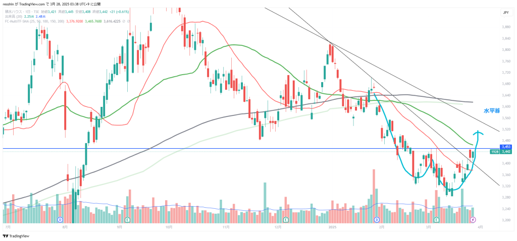 W字のブレイクアウトや下落トレンドラインのブレイクアウトと思っていたのと、権利付き最終日だったことで配当も気になってIN。