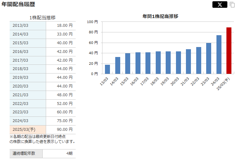 企業のホームページには、「配当金については、安定的・継続的に増配を行うよう努めていきます。」と書いてあり、増配が明言されています。