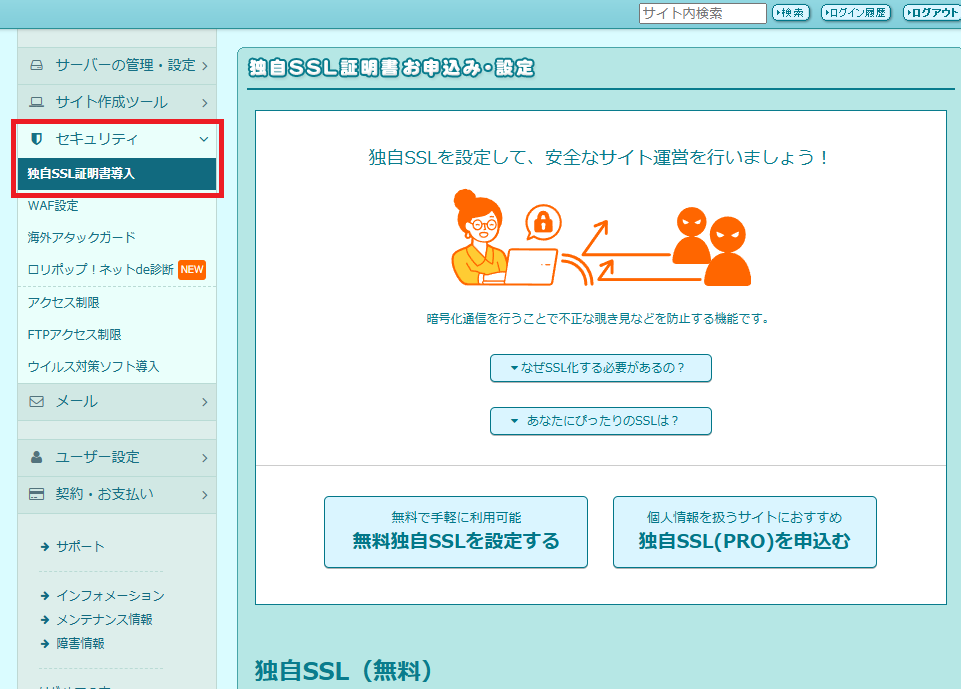 私が利用しているロリポップでは、「ユーザー専用ページ」にログイン後に下記のセキュリティタブにある「独自SSL証明書導入」から無料でSSL化できます。