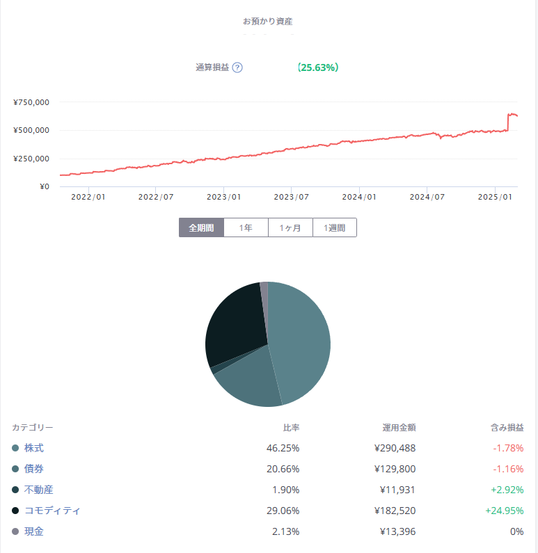 ロボアドバイザー 2025/3/2 ロボアドバイザー X Facebook はてブ LINE コピー 2025.03.02 目次 WealthnaviFolio robo proコメント Wealthnavi Folio robo pro コメント 債券の割合が普段より高くなっていますね。不安定な相場に合わせて変更でしょうか。