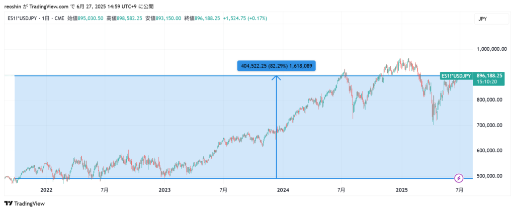 同じ期間のS&P500先物を日本円換算したチャートが以下で、+82.29%でした。