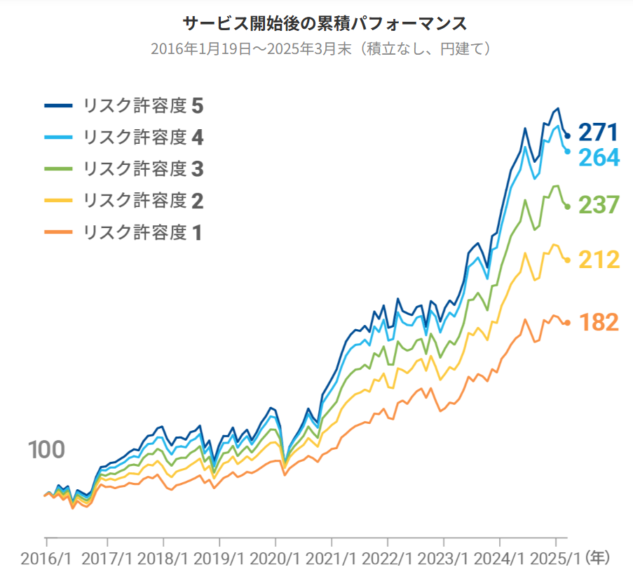 一方で、Wealthnaviと同様に2024年末から4月にかけては、S&P500を円換算したものが24.11%下落したのに対し、FOLIO ROBO PROは13.88%しか下落していません。
