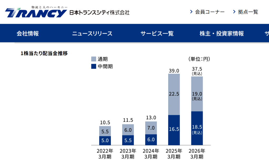 日本トランスシティは、配当性向40%もしくはDOE2.0%のいずれか高い水準を目安とし、2025年3月期は年間配当39円(中間16.5円、期末22.5円)を実施しました。2026年3月期は37.5円(中間18.5円、期末19円)を予定しています。
