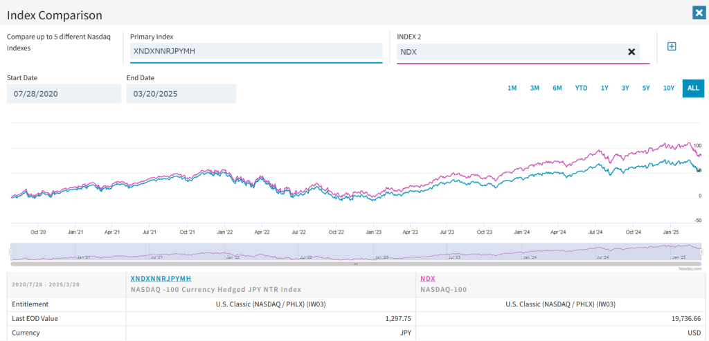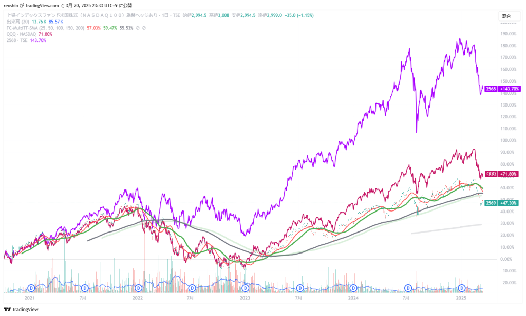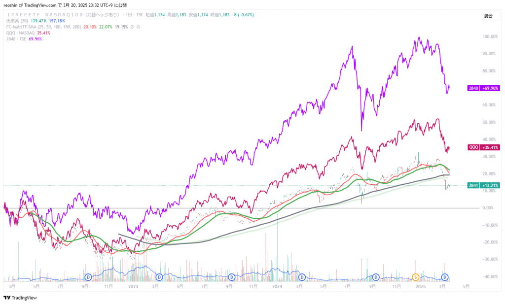 ヘッジありの経費なのか、QQQとの乖離が目立ちます。