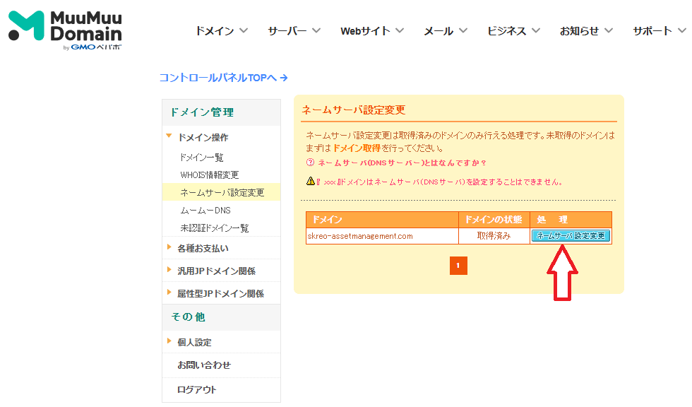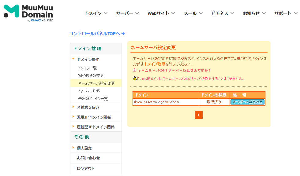 そこから画面左の「ドメイン操作」タブにある「ネームサーバ設定変更」を押し、上記画面を出します。