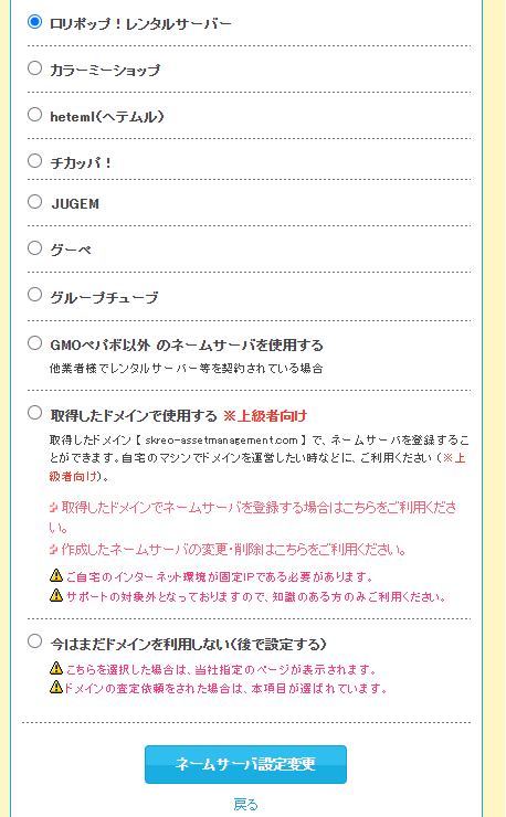 「ロリポップ!レンタルサーバー」にチェックを入れて、「ネームサーバ設定変更」ボタンを押します。