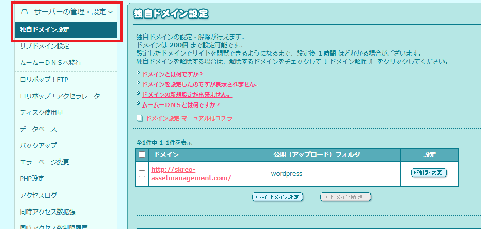 ロリポップにログインして、「独自ドメイン設定」を押します。