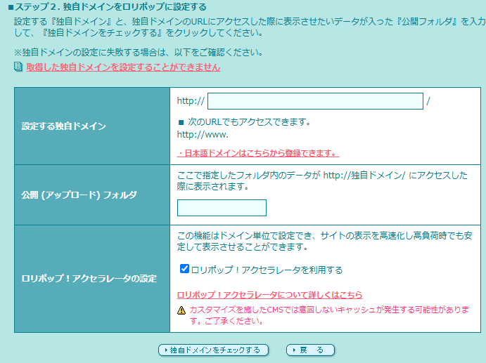 その後に「独自ドメインをチェックする」ボタンを押して、そのあとに「設定」ボタンを押して、「戻る」ボタンを押せばOKです。