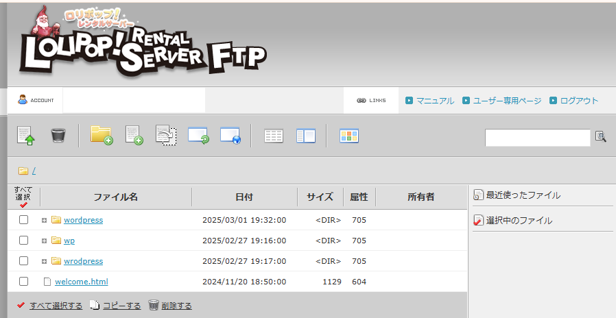 上記にも書きましたが、ロリポップにログインしてFTP>>wordpress>>wp-contentで以下のページにたどり着きます。