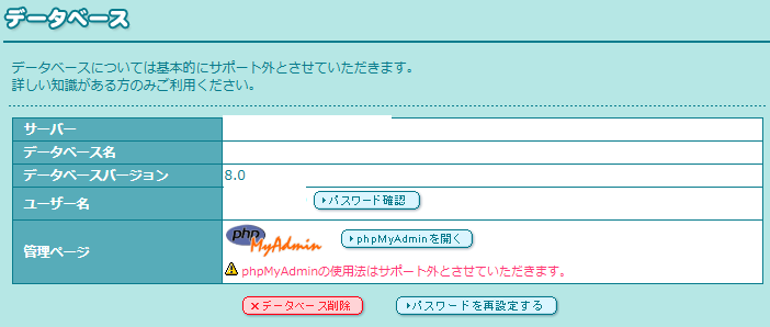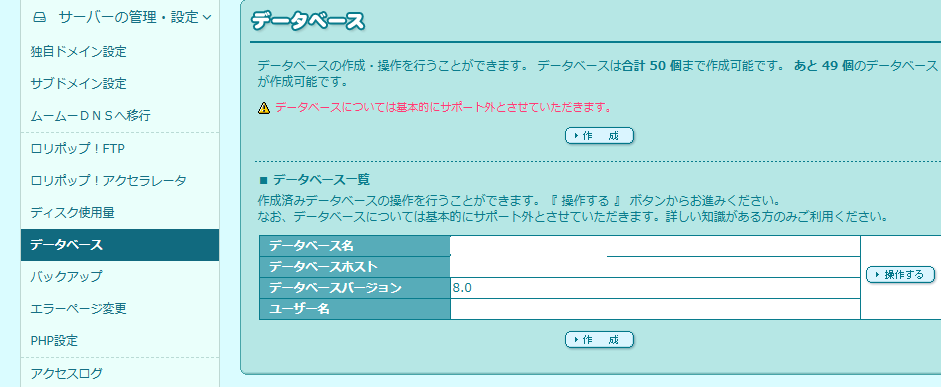 ロリポップにログインして、「データベース」を開きます。「操作する」ボタンを押します。