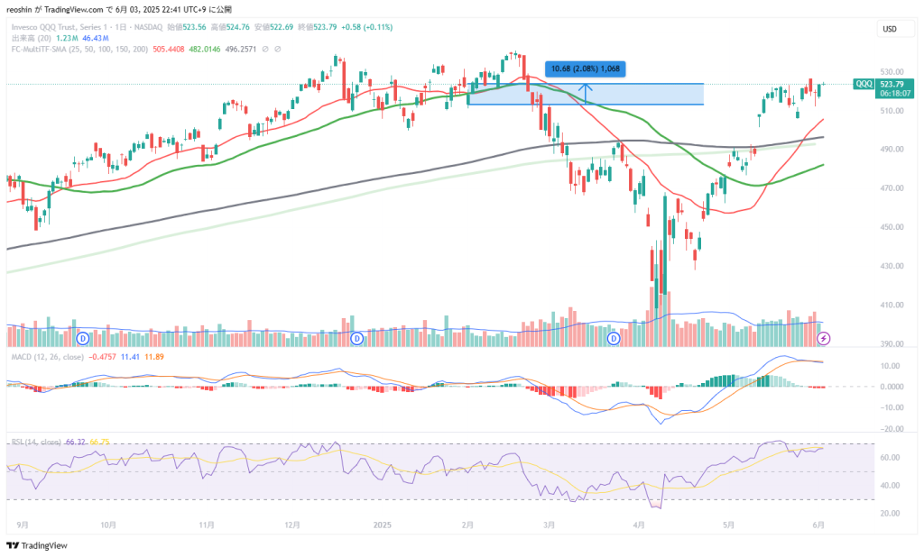 本日の始値$523に対して25株で+$923という結果で、6/3のドル円の始値である142.65円で円転すると+13万1666円でした。ただし、上述した通りでこのシミュレーションに該当するのはドルを稼いでいて、元々の資産がドルの人です。日本に住んで円を稼いでいる私みたいな人は、結局は円をドル転してQQQを買うことになるので、円建てQQQシミュレーションに該当します。