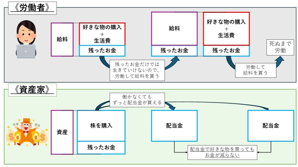 一方で、資産家は自分の好きなものを買う前に好きなものを作っている会社の株を買います。株を買うことで、その会社から配当金を得ることができます。配当金は、その会社が潰れたり業績が悪くならない限りは永遠に貰えます。貰える配当金が多ければ、いくらお金を使っても労働せずとも収入として入ってくる配当金の方が多くなり、お金が無くなることはありません(配当金が減らない限りは、お金のために労働する必要もありません)。