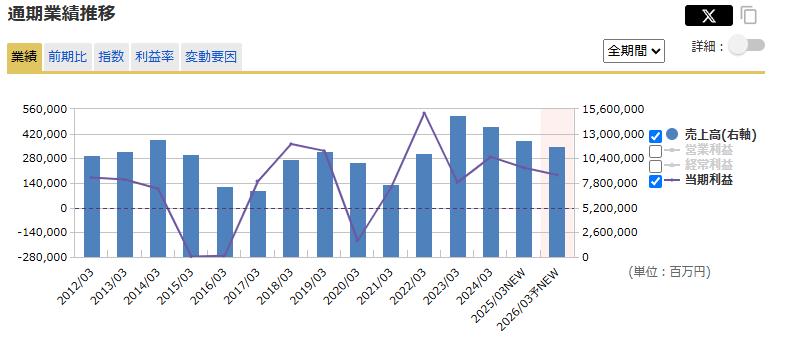 2026年3月期は、売上高11兆7,000億円(▲5.1%)、営業利益3,600億円(+239.3%)、親会社株主に帰属する当期利益1,850億円(▲18.2%)を見込んでいます。