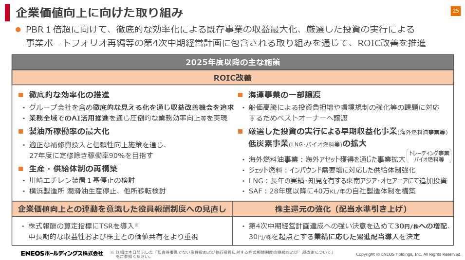 前期に発生したのれんの減損損失や再エネ減損損失が剥落する一方、JX金属の売却益がなくなることから、全体としては減益予想です。ただし、石油製品部門で2,400億円、電気事業で230億円の営業利益を計画しており、基礎的な収益力は改善傾向です。