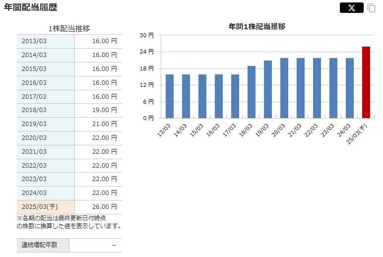 2025年3月期の年間配当は26円(前期比+4円)に増配。配当性向は32.5%と上昇しました。2026年3月期も年間30円(中間15円、期末15円)とさらなる増配を予定しており、累進配当の姿勢を示しています。