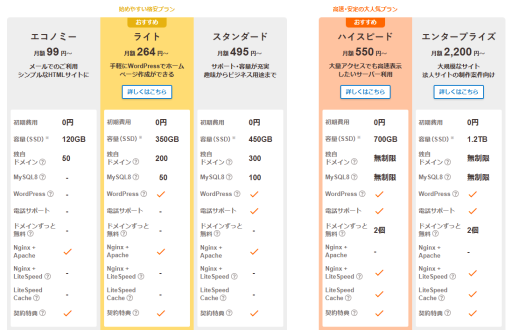 私自身は値段でライトプランを選びましたが、独自ドメインは別個で契約する必要があったのでロリポップと提携しているムームードメインで独自ドメインは取得しています。独自ドメインを別で取得する形になっても、ライトプランはかなり安い印象です(ドメインによって取得費や維持費が違うので一概には言えませんが)。